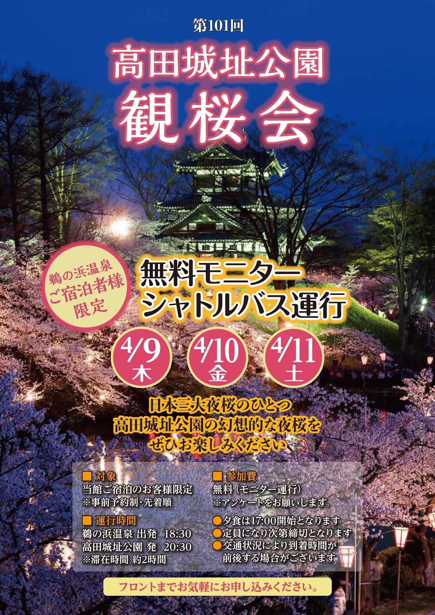 鵜の浜温泉にご宿泊されるお客様限定で、高田城址公園観桜会会場まで無料でシャトルバスが運行されます♪